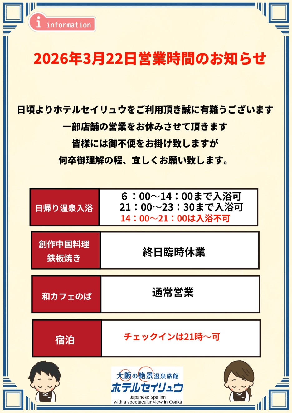 2026年3月21日の営業時間・一部臨時休業店舗のお知らせ